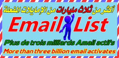 اليوم ان شاء الله سأهديكم مليار Email List مجانا التي يمكنك ان تعمل بها كالتسويق الكتروني للربح او استخدامها على الفيس بوك للارسال طلبات الصداقة في دفعة واحدة او استخدامها في ' السبام ' ولكن هذا الاخير لا ننصح بها فحرام وحرام ولا نتحمل اي مسؤولية وما يغضب عليه الله .. على كل حال , هذه الايمايلات من جميع انحاء العالم واغلبها Gmail - جيميل واكثر من مليون ايميل عربي مدمج معها . فكل شخص سيعرف كيف سيستفيد منها وكيف سيعمل بها فلكم حرية في ذالك .